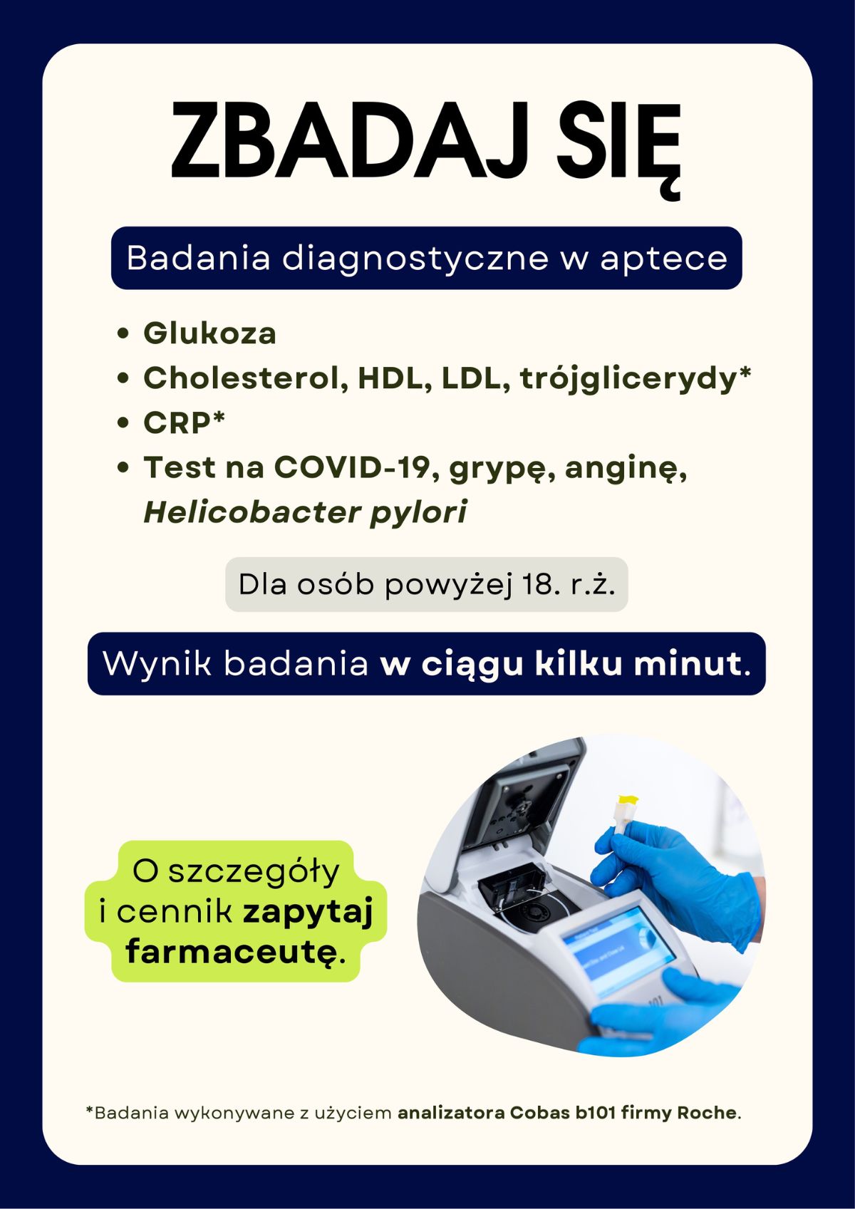 Apteki Fantazja to mikrosieć aptek założona przez farmaceutkę – Jolantę Staszczak w 1998 roku. Pierwsza z aptek mieszcząca się w Centrum Handlowym Zakopianka w Krakowie działa nieprzerwanie od ponad 26 lat. W skład sieci wchodzą dwie apteki mieszczące się na terenie Krakowa i jedna apteka zlokalizowana w Katowicach. Obecnie nasz zespół tworzy 14 magistrów farmacji, 9 techników farmaceutycznych i 4 pomoce apteczne. W swojej codziennej pracy łączymy ducha tradycji farmaceutycznej z nowoczesnością, stawiając pacjenta zawsze w centrum uwagi. ul. Borkowska 3 tel. 721 458 500 Godziny otwarcia: Kraków ul. Zakopiańska 62 tel. 721 458 501 Godziny otwarcia: Kraków al. Walentego Roździeńskiego 200 tel. 32 203 97 41 Godziny otwarcia: Katowice Robot apteczny współfinansowany ze środków Unii Europejskiej w ramach projektu „Cyfrowy rozwój firmy poprzez inwestycję w nowoczesne środki trwałe i specjalistyczne oprogramowanie” wspiera pracę naszych farmaceutów, dzięki czemu możemy rozszerzać zakres i podnosić jakość naszych usług. Istnieje możliwość zgłoszenia podejrzenia o niezgodności realizowanego projektu lub działań Beneficjenta z KPP lub KPON do IZ na adres mailowy KPP_KPON@umwm.malopolska.pl lub w innej formie jeśli wynika to ze szczególnych potrzeb komunikacyjnych zgłaszającego / zgłaszającej. Szczegółowy opis procedury zgłoszenia niezgodności KPP/KPON dostępny jest na stronie programu FEM. Zakończyliśmy realizację projektu „Cyfrowy rozwój firmy poprzez inwestycję w nowoczesne środki trwałe i specjalistyczne oprogramowanie” współfinansowanego ze środków Unii Europejskiej, który umożliwił wprowadzenie do naszego portfolio nowej usługi – wykonywania badań diagnostycznych w aptece. Oferujemy badania poziomu glukozy, cholesterolu, HDL, LDL, trójglicerydów, CRP oraz wykonywanie testów na COVID-19, grypę, anginę i Helicobacter pylori.